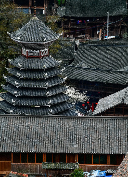 2024年3月17日拍摄的贵州省榕江县栽麻镇大利侗寨鼓楼。鼓楼是侗族的文化符号之一,每个侗寨至少有一座,是侗族人民集中议事、评断是非的公共场所,也是侗家人出生和去世时必须要停留的场地。