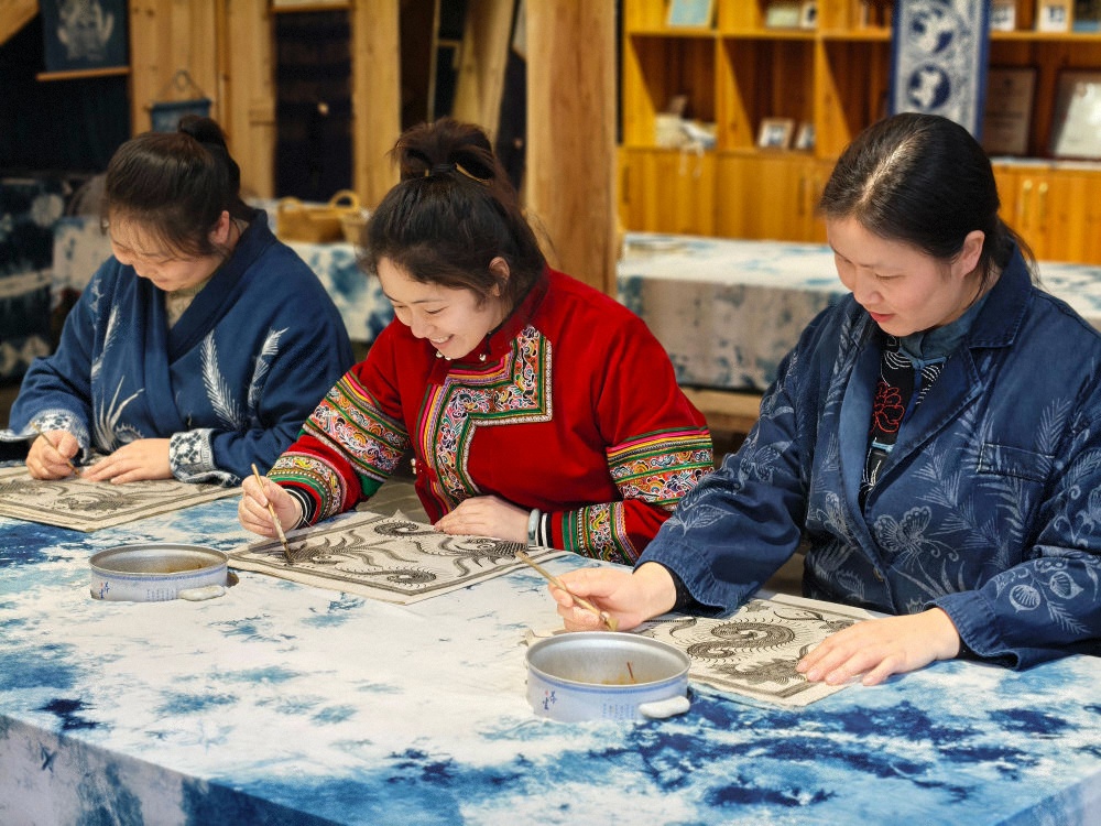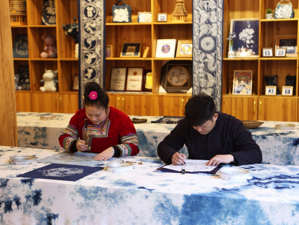 2025年3月14日,村民在肇兴侗寨内制作蜡染。近年来,当地加大对少数民族非遗文创产品的研发和创新力度,同时进一步加强线上销售,通过微信、网上直播、网店等方式进行带货,让当地群众通过指尖增收致富。
