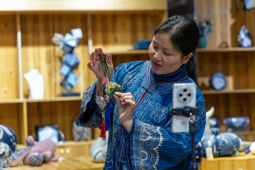 2025年3月14日,村民在肇兴侗寨内通过手机直播销售刺绣作品。侗绣承载着侗族人的信仰与记忆,年轻绣娘的手艺多半来自母亲传承,侗族妇女用一针一线将民族古老的神话传说、历史风俗记录在服饰的纹样里,让这门手艺在侗乡世代传承。2011年,侗族刺绣被列入国家级非物质文化遗产名录。