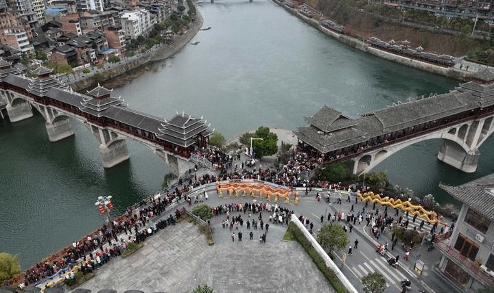 2024年2月22日,在贵州省黔东南苗族侗族自治州锦屏县,舞龙队经过两座风雨桥的交汇处。风雨桥,又称“花桥”,是侗族的标志性建筑之一。因桥上建有廊和亭,既可行人又可遮蔽风雨,故称风雨桥。其以木为料、以榫衔接,是侗族桥梁建筑艺术的结晶。鼓楼、花桥的侗族木构建筑营造技艺被列入国家级非物质文化遗产代表性项目。