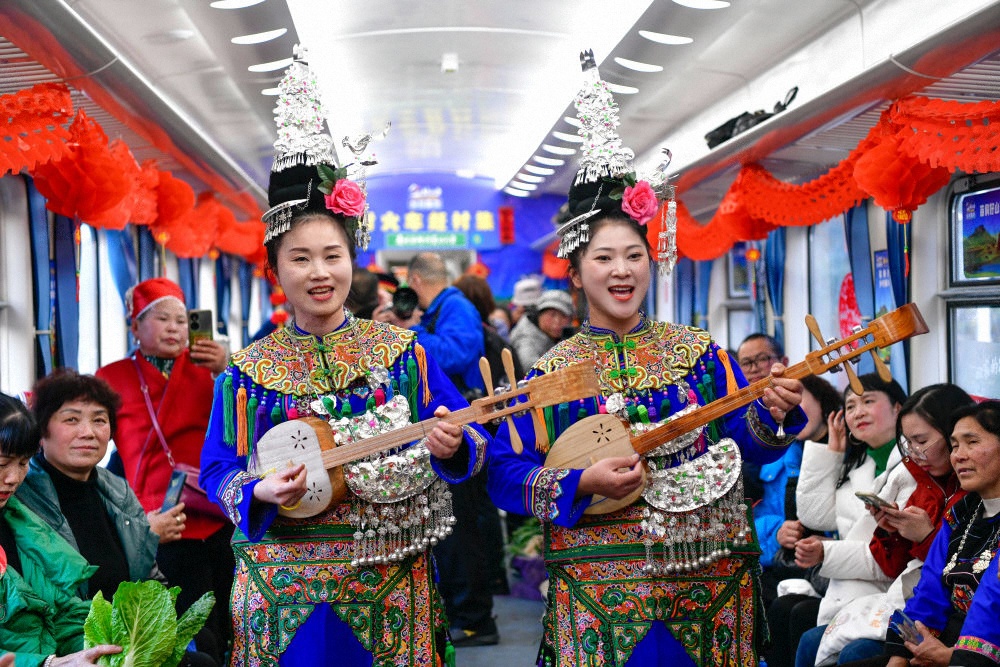 2025年1月18日,少数民族演员在5640次列车上给乘客和村民弹唱侗族琵琶歌。当日,2025年全国乡村“村晚”示范展示活动暨“村火车上的村T村晚”启动仪式,在贵阳开往玉屏的5640次“慢火车”上举行。活动串联起沿途的站点和村寨,让绿皮火车成为流动的乡村集市,向全国观众展现喜庆祥和的侗寨新画卷。2006年,侗族琵琶歌被列入国家级非物质文化遗产名录。