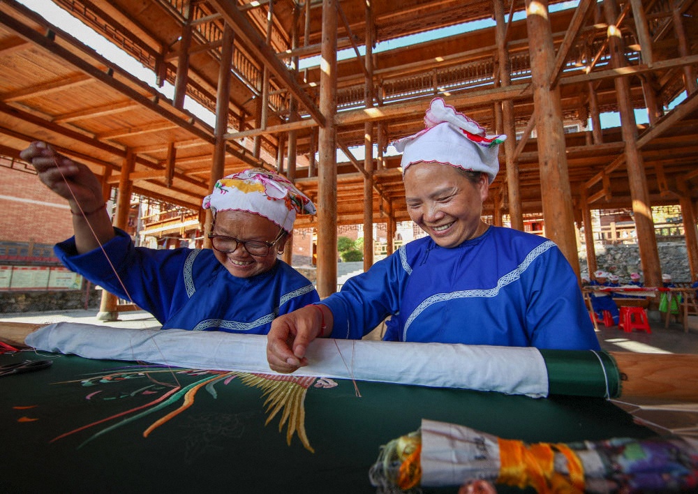 2021年9月27日,贵州省镇远县报京乡报京村村民邰木香(右)在制作侗绣。邰木香将侗族的民间故事以刺绣形式展现出来,还先后开发出传统与现代相结合的侗族服饰、工艺包、绣花鞋、围腰、头巾、枕巾等系列产品,深受国内外客商的青睐,致富的同时带动当地300多名绣娘实现就业增收。