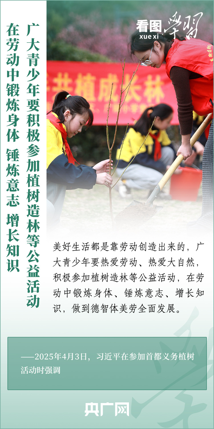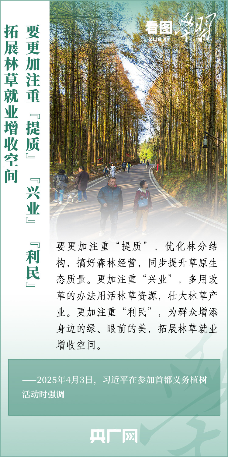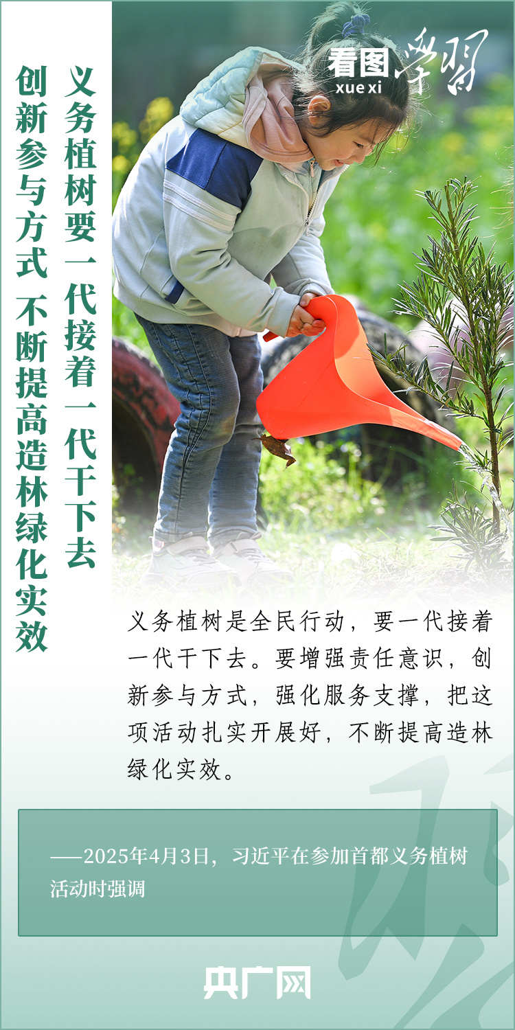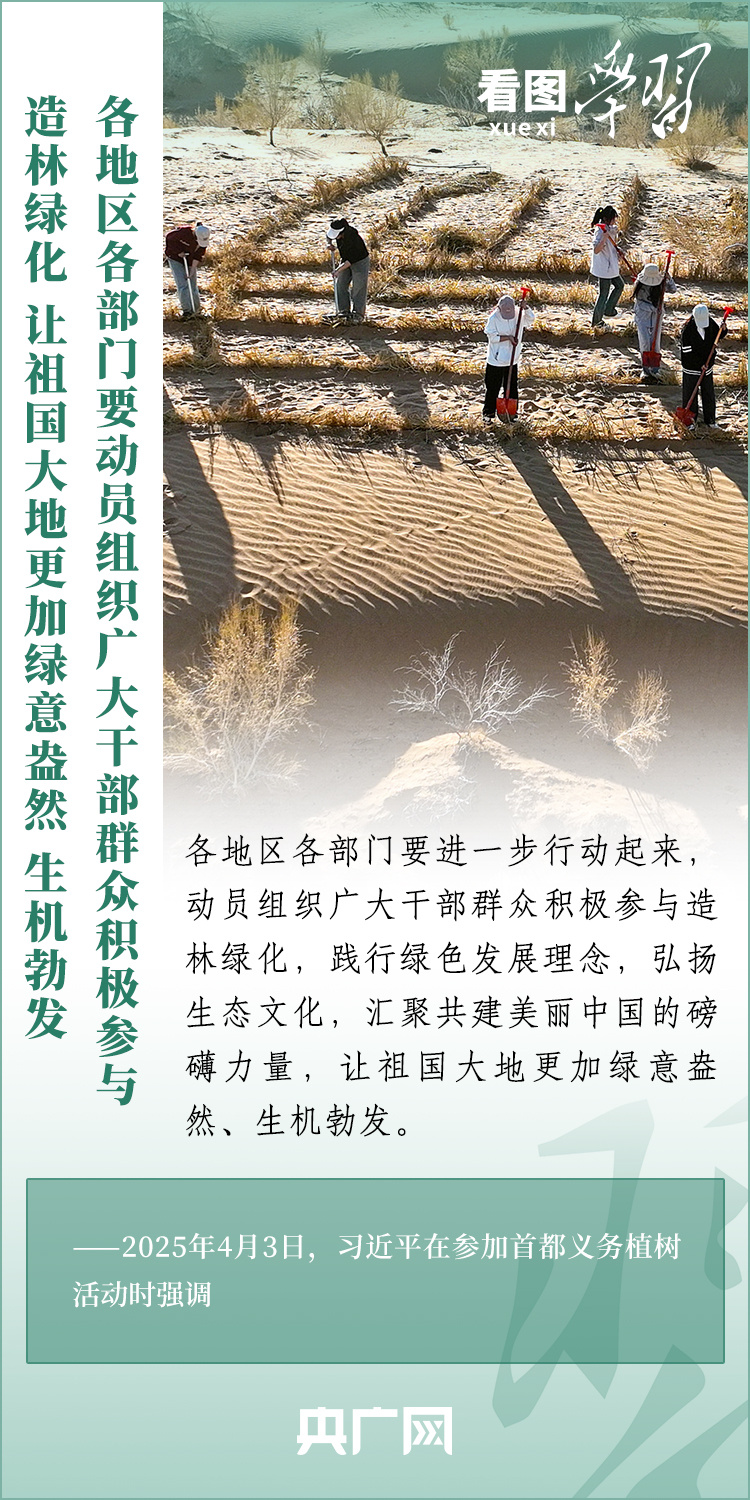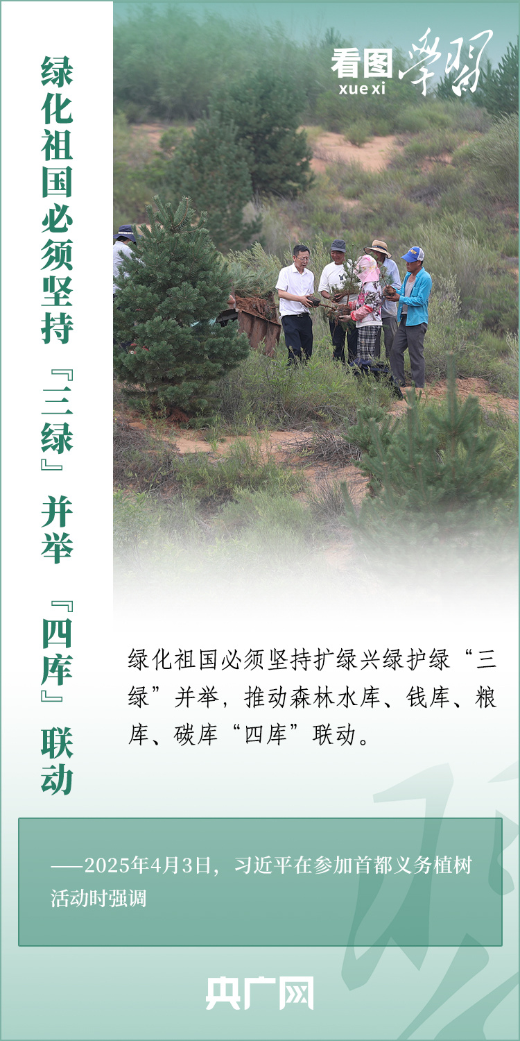 植树造林是生态文明建设重要一环。4月3日,习近平总书记参加首都义务植树活动。在植树现场,总书记高度肯定国土绿化工作取得来之不易的成绩,强调绿化祖国必须坚持“三绿”并举、“四库”联动,要更加注重“提质”“兴业”“利民”,“汇聚共建美丽中国的磅礴力量,让祖国大地更加绿意盎然、生机勃发”。一起来学习!