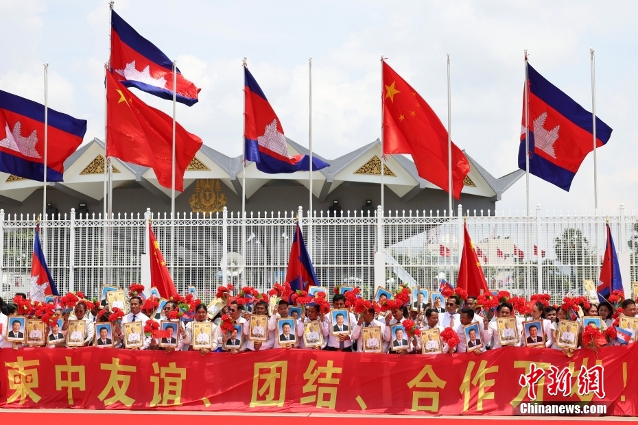 当地时间4月17日上午,中国国家主席习近平乘专机抵达金边,应柬埔寨国王西哈莫尼邀请,对柬埔寨进行国事访问。数百名当地民众挥舞两国国旗,手持“柬中友谊、团结、合作万岁!”等红色横幅,热烈欢迎习近平到访。中新社记者 盛佳鹏 摄
