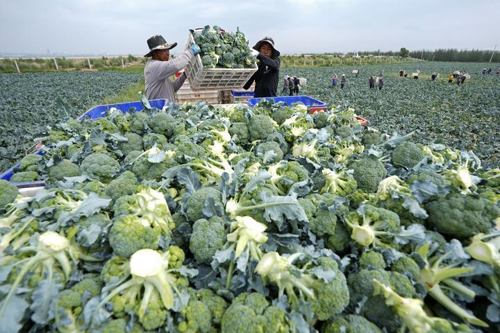 2025年7月18日,工作人员在宁夏固原市原州区彭堡镇万亩冷凉蔬菜基地运输西兰花。固原依托高海拔、气候冷凉等“冷资源”优势,大力发展冷凉蔬菜产业,着力打造“六盘山冷凉蔬菜”区域公用品牌。目前已建成冷凉蔬菜规模化种植基地130余个,种植面积稳定在50万亩,年产鲜菜200万吨以上。“六盘山冷凉蔬菜”这张打造的“绿色名片”,已成为当地乡村振兴发展之路上的“热产业”。