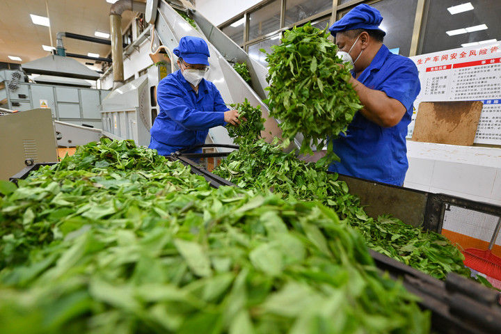 2025年6月7日,工人在海南省农垦五指山茶业集团股份有限公司保亭金江五指山分公司茶厂加工茶叶。海南大叶茶是海南省中部山区特有的茶种,在2024年被证实和发现是一种新的山茶属物种。目前,五指山、保亭、白沙等市县不断扩大种植规模,将茶产业作为巩固脱贫攻坚和推进乡村振兴的重要抓手,把绿叶变成百姓致富“黄金叶”。