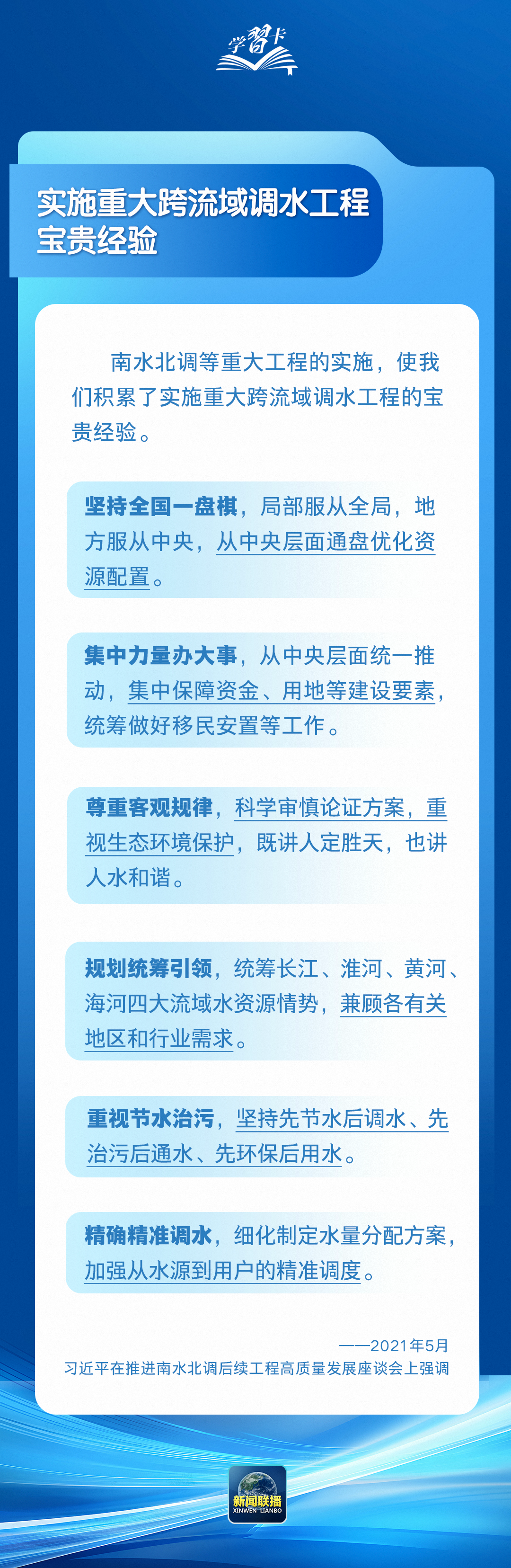 水是生存之本,文明之源。党的十八大以来,党中央统筹推进水灾害防治、水资源节约、水生态保护修复、水环境治理,建成了一批跨流域跨区域重大引调水工程。