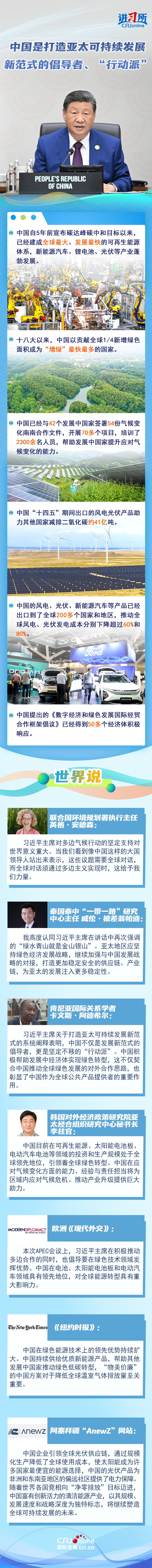 国际社会认为,中国不仅是打造亚太可持续发展新范式的倡导者,更是坚定不移的“行动派”,亚太地区应坚持绿色经济发展战略,继续加强与中国发展战略的对接,打造更加稳定安全的供应链、产业链,为亚太的发展注入更多稳定性。