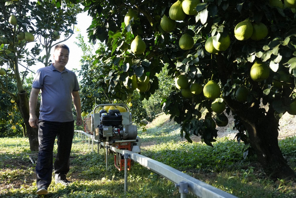 2025年11月7日,柚农在梅州南福金柚种植基地测试柚子甜度。