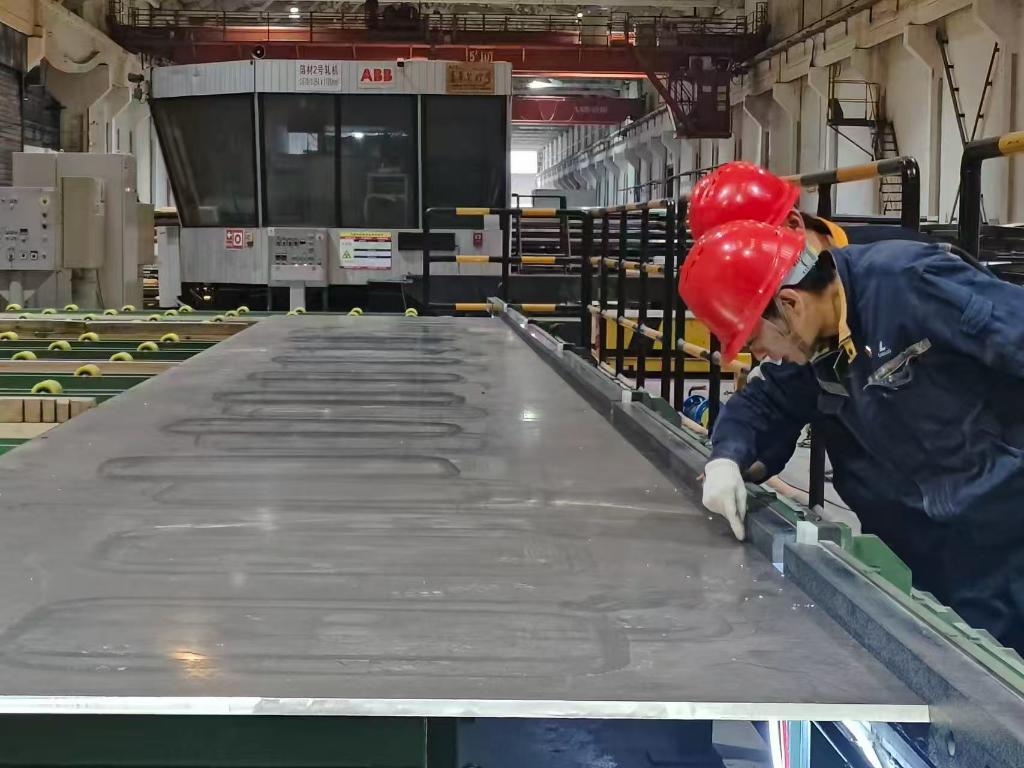 重庆西南铝机电设备工程有限公司铝材精深加工基地的检测线上,技术人员在对LNG船板的直线度进行抽检。(受访者供图)