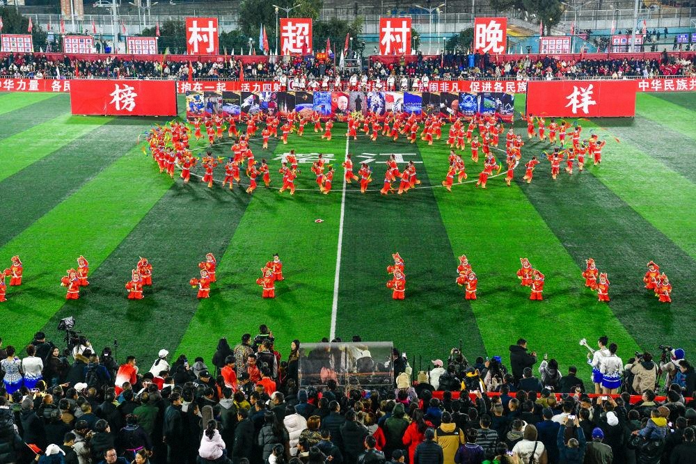 △2026年1月2日,第四届贵州"村超"开幕式暨"村超村晚"活动在榕江县举行,这是学生在活动现场表演。