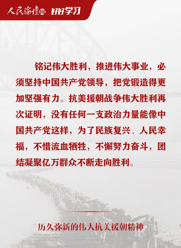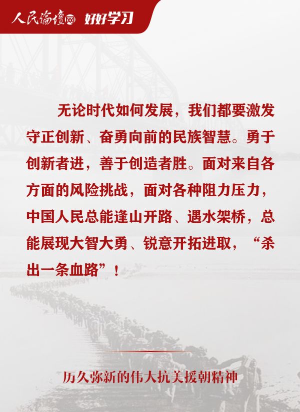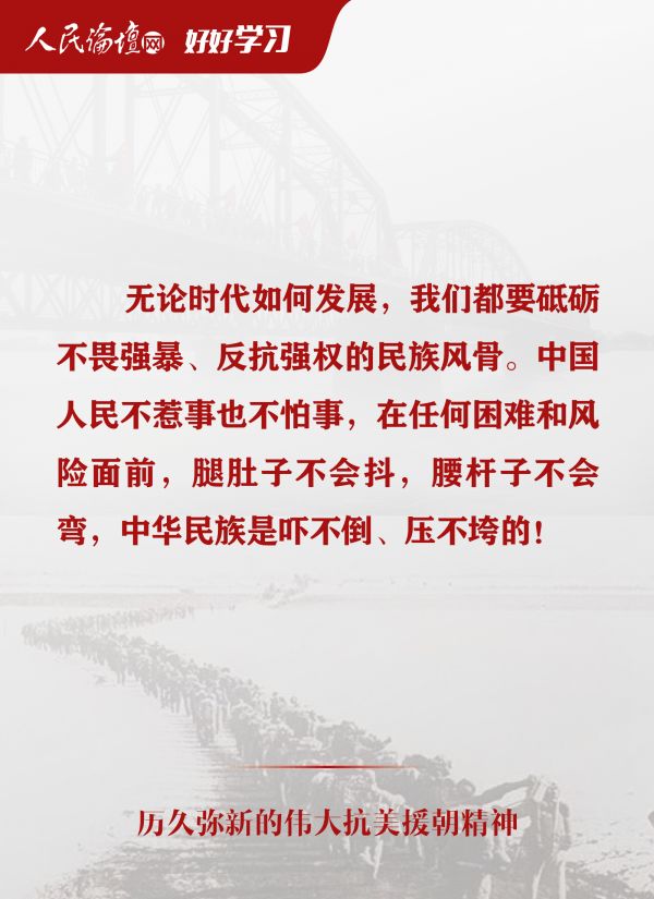 我们要铭记抗美援朝战争的艰辛历程和伟大胜利,敢于斗争、善于斗争,知难而进、坚韧向前,把新时代中国特色社会主义伟大事业不断推向前进。