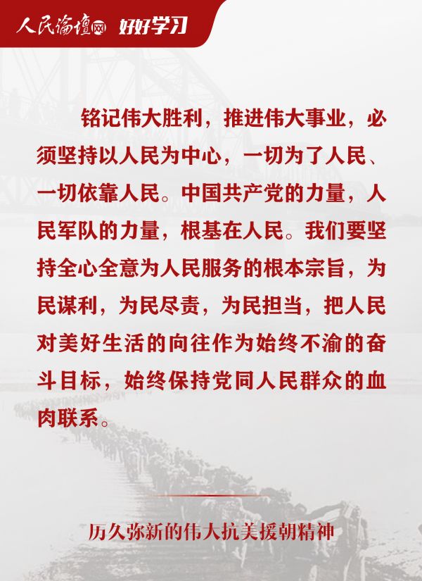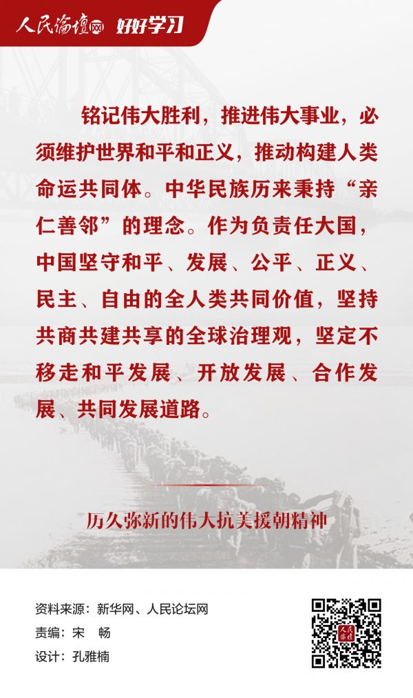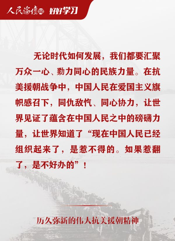 近日,习近平总书记在纪念中国人民志愿军抗美援朝出国作战70周年大会上发表重要讲话并引发热烈反响,他强调,我们要铭记抗美援朝战争的艰辛历程和伟大胜利,弘扬伟大抗美援朝精神,雄赳赳、气昂昂,向着全面建设社会主义现代化国家新征程,向着实现中华民族伟大复兴的中国梦继续奋勇前进。历史是最好的教科书,总是在一些特殊年份给人以启示和力量。站在实现“两个一百年”奋斗目标的历史交汇点上,我们要认真学习领会、坚决贯彻落实总书记重要讲话精神,为实现中华民族伟大复兴的中国梦而努力奋斗。今天,人民论坛网撷取部分讲话内容,与您一起学习。