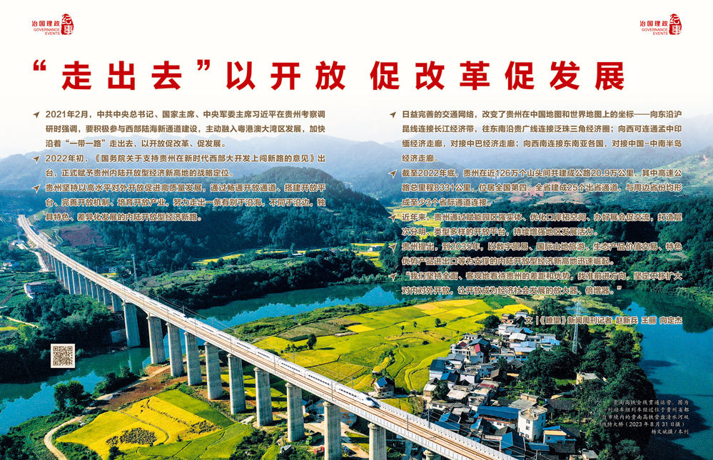 沿着总书记指引的方向,贵州积极服务和融入国家战略。2022年11月,贵州省委、省政府印发《贵州省建设内陆开放型经济新高地实施方案》,制定43项重点任务举措及60项重点任务清单、32项争取事项清单,系统谋划“双循环”联动发展区、开放型产业集聚区、服务贸易创新区、制度型开放试验区和西部地区重要国际货运枢纽“四区一枢纽”开放定位。