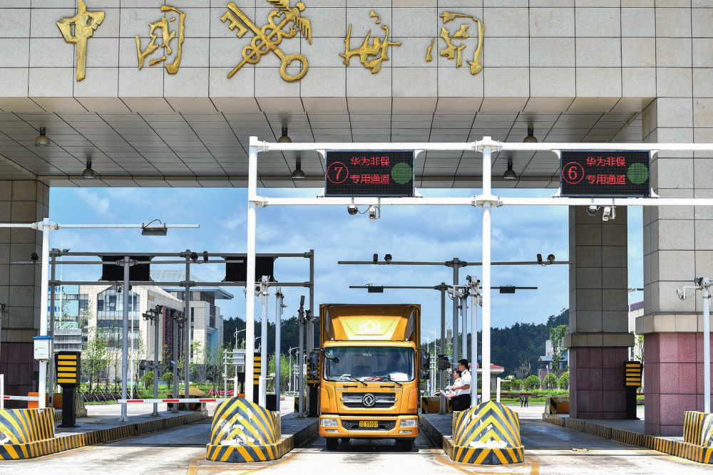 贵阳海关工作人员监管车辆通过海关卡口 贵阳海关供图