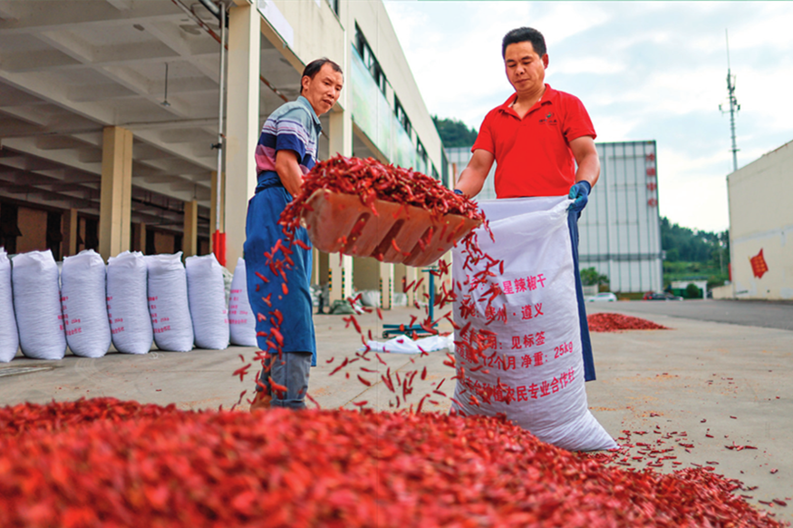 在贵州省遵义市中国辣椒城,工人将辣椒装袋(2023 年 6 月 6 日摄)刘续摄 / 本刊