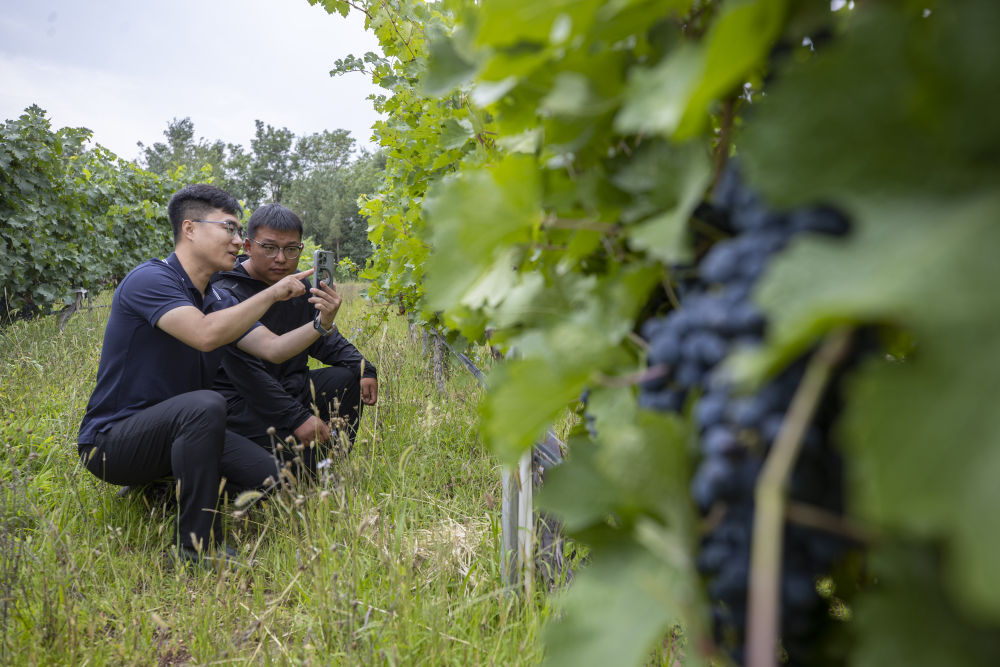 2024年8月15日,技术人员(左)和工作人员在宁夏银川市西夏区的一个葡萄园工作。为推动黄河流域生态保护和高质量发展先行区建设,银川市积极打造高标准葡萄园,借助各种传感器监测酿酒葡萄的生长状态,实现精准灌溉,从而高效节约黄河水。