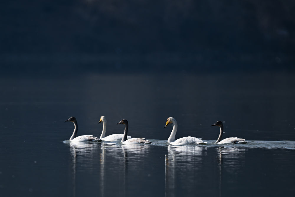 2024年3月16日在内蒙古呼和浩特市托克托县黄河湿地拍摄的天鹅。随着当地生态环境持续改善,候鸟数量连年增加。