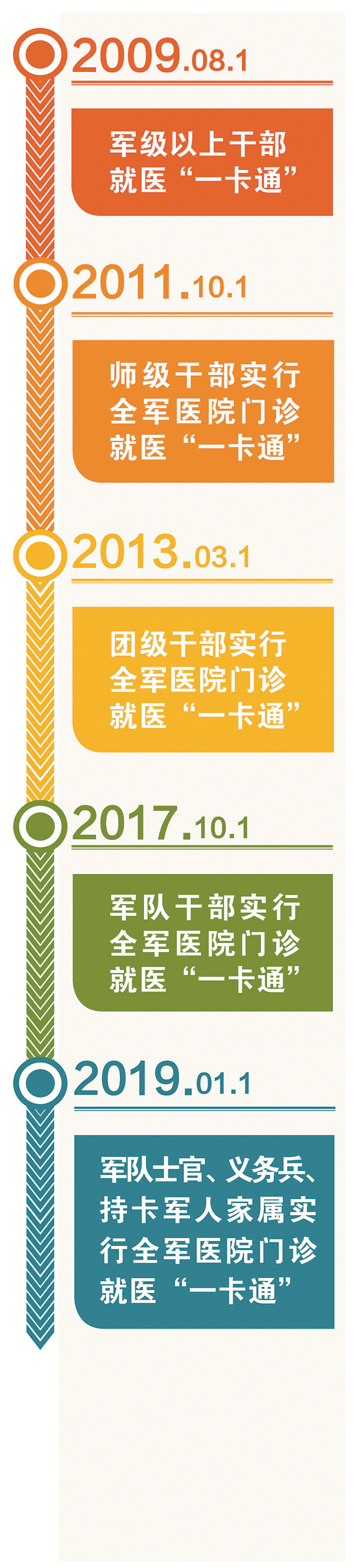 继全军干部在军队医院门诊就医实现“一卡通”后,从2019年1月1日起,全军士官、义务兵、学员及持有军人保障卡的军人家属实现军队医院门诊就医“一卡通”。