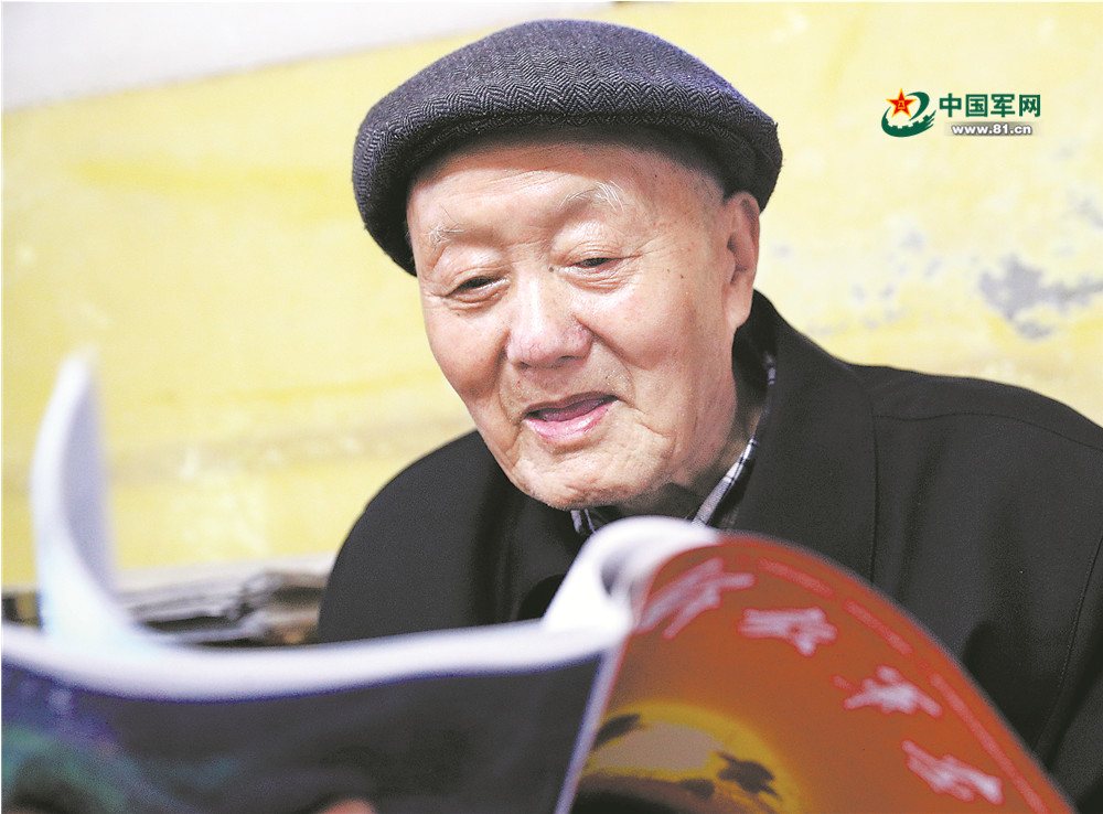95岁高龄的老英雄张富清阅读《解放军画报》。解放军报记者 穆可双 摄