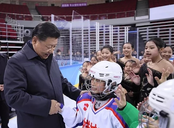 2017年2月24日,习近平在北京五棵松体育中心观摩了青少年冰球和花样滑冰训练,他拉着一位小冰球队员的手,俯下身,与他肩碰肩,做了一个“对抗”的姿势,笑着说,小伙子块头要再长大一点。