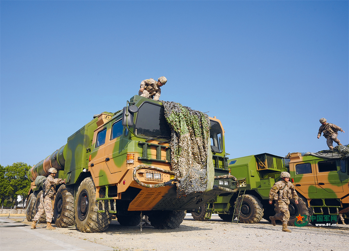 海军岸导部队官兵撤收伪装展开装备。闫小波 摄