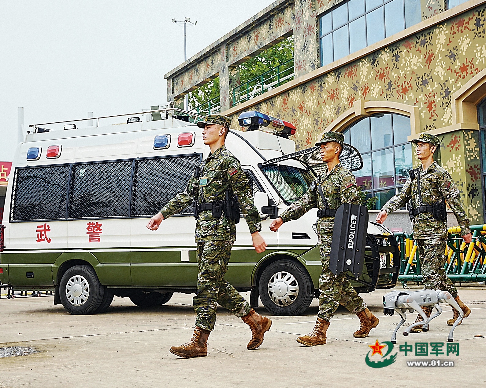 近日,武警山东总队青岛支队官兵携机器狗等装备巡逻执勤。杜宪法摄