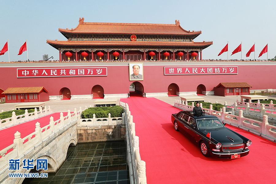 10月1日,庆祝中华人民共和国成立70周年大会在北京天安门广场隆重举行。中共中央总书记、国家主席、中央军委主席习近平发表重要讲话并检阅受阅部队。这是习近平乘坐检阅车,经过金水桥,驶上长安街。 新华社记者 庞兴雷 摄