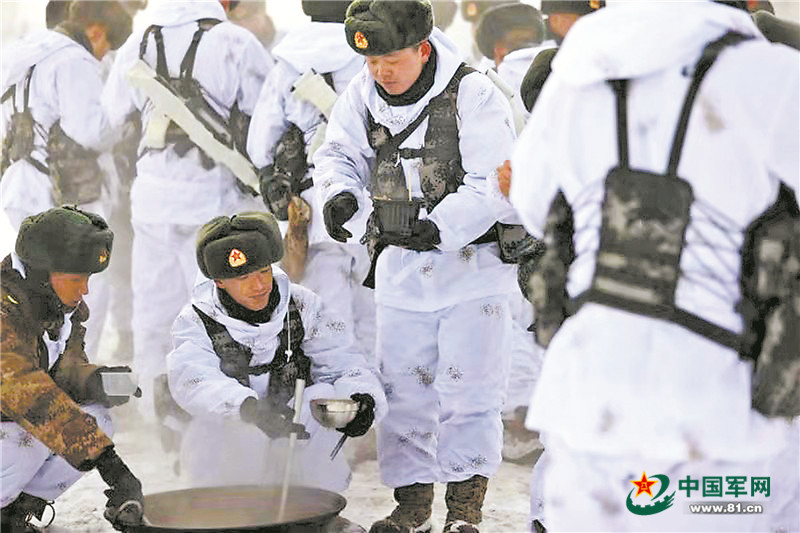 新疆军区某合成师官兵在高原冬季演练间隙,进行热食补充。周凯威摄
