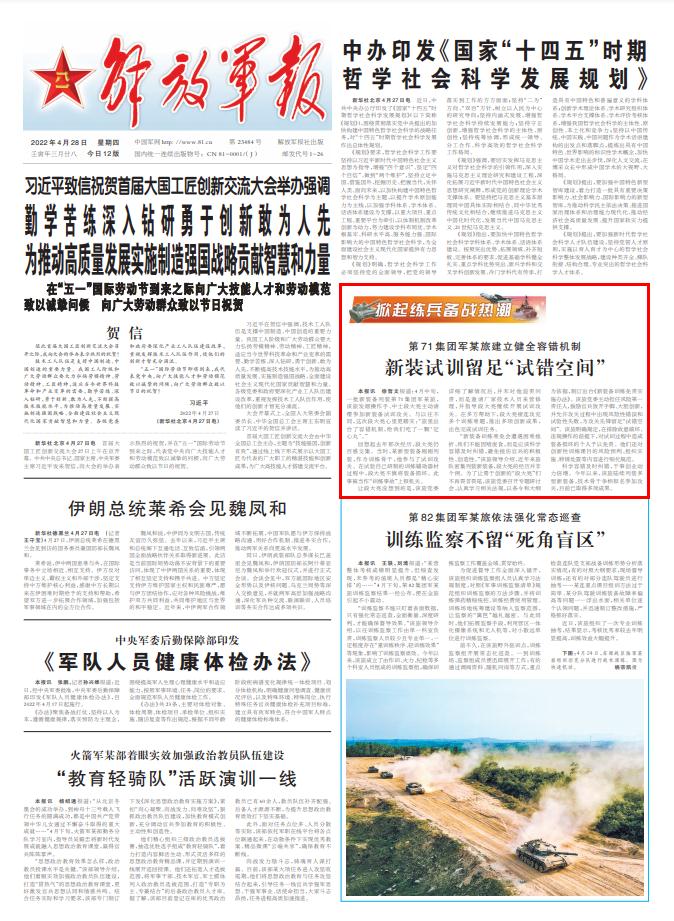 解放军报讯 徐哲文报道:4月中旬,一批新装备列装第71集团军某旅,该旅发烟操作手、中士段大亮主动请缨参加新装备试训攻关。与以往不同,这次段大亮心里更踏实:“旅里出台了容错机制,给我们吃了一颗‘定心丸’。”