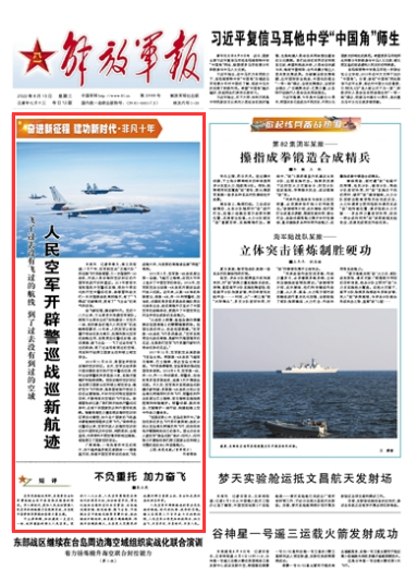 奋飞新征程,建功新时代。党的十八大以来,习主席多次视察空军部队。按照习主席发出的“加快建设一支空天一体、攻防兼备的强大人民空军”的战略转型要求,10年来,人民空军以有效履行使命任务为牵引,拓展和深化空军的战略应用,实现常态化警巡东海、战巡南海、绕飞台岛……飞了过去没有飞过的航线,到了过去没有到过的空域,用实际行动捍卫国家主权和领土领空安全。