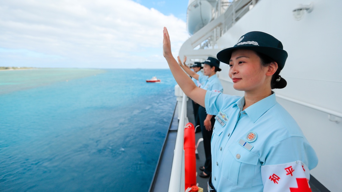 中国海军“和平方舟”号医院船结束访问汤加时,任务官兵中的文职人员向欢送人群挥手告别(2023年8月4日摄)。新华社发(徐巍 摄)