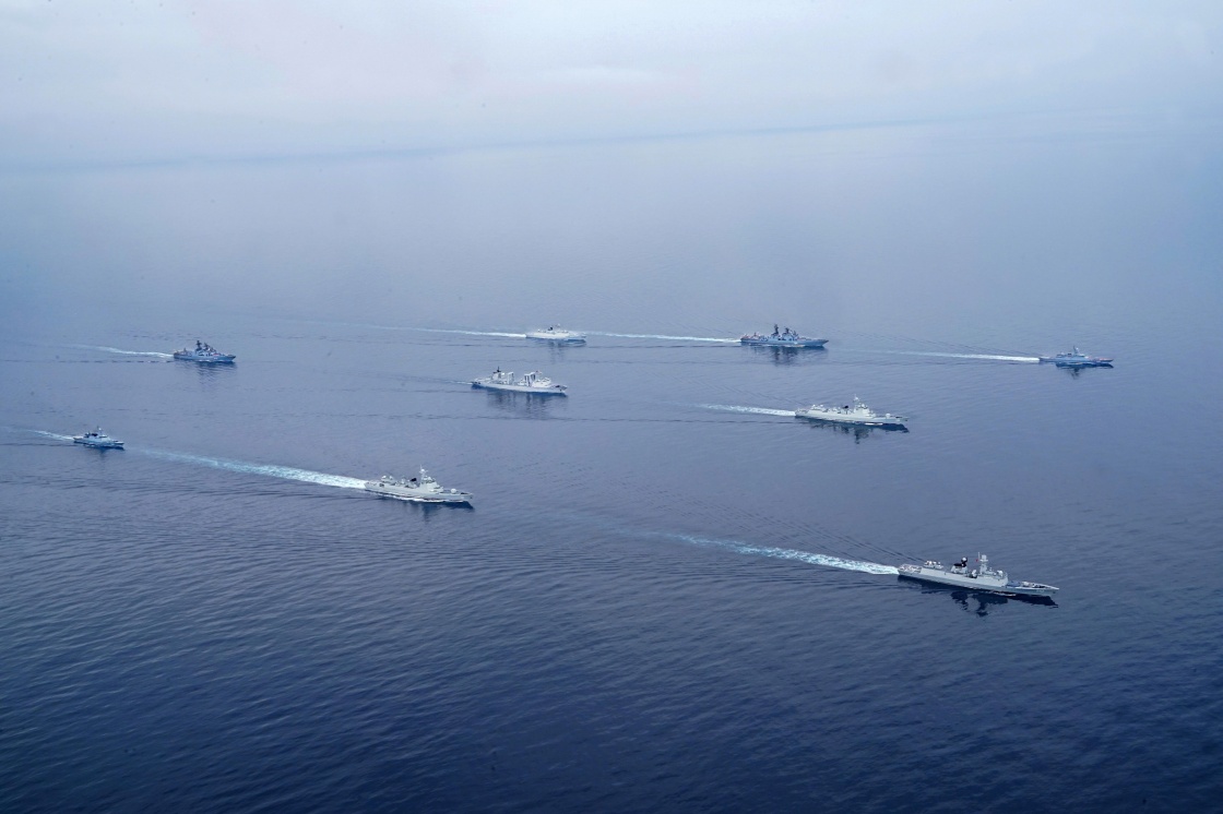 2023年7月20日,在日本海某海域进行的“北部·联合-2023”演习中,中俄参演舰艇编队开展海空护航演练。新华社发(刘丹 摄)