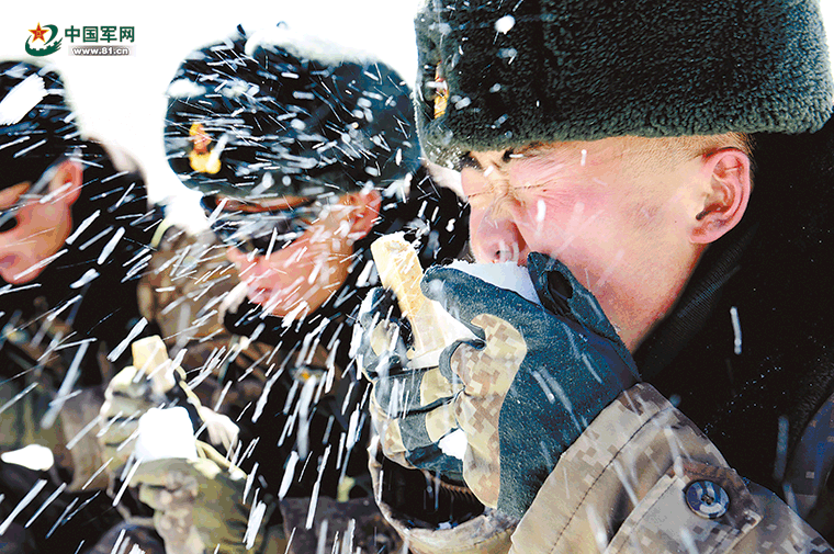 由于水壶冻成冰壶,驻守西藏塔克逊哨所的官兵巡逻途中用雪块伴干粮充饥。罗 凯摄