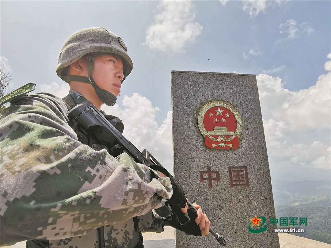 南部战区陆军某边防旅,一名战士守卫祖国界碑。