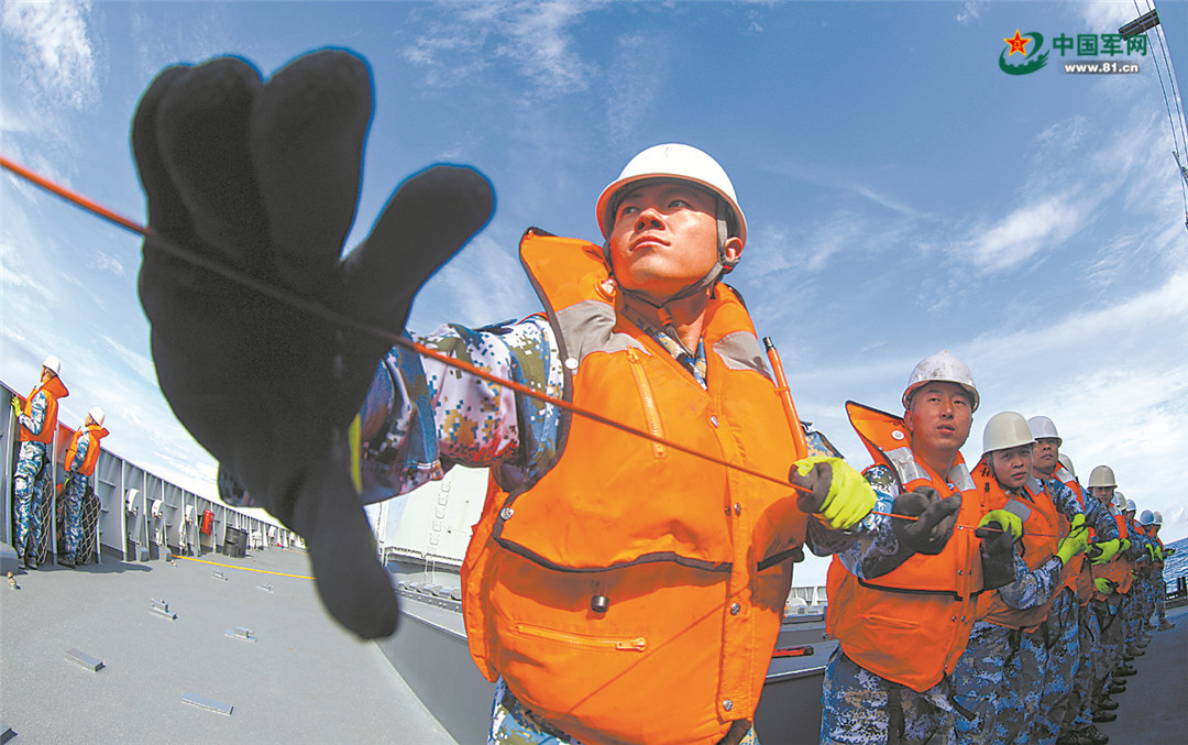 银川舰甲板上,官兵奋力拉住查干湖舰发射的引缆,在两舰之间架起承载索后对接输油管线,展开油料补给。随后,干货补给站也开始接收补给。