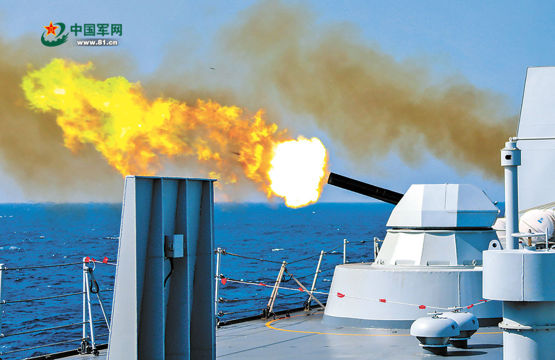 “预备——放!”随着指挥员一声令下,一枚枚炮弹划破海空。数秒钟后,目标区域火光冲天,硝烟弥漫。