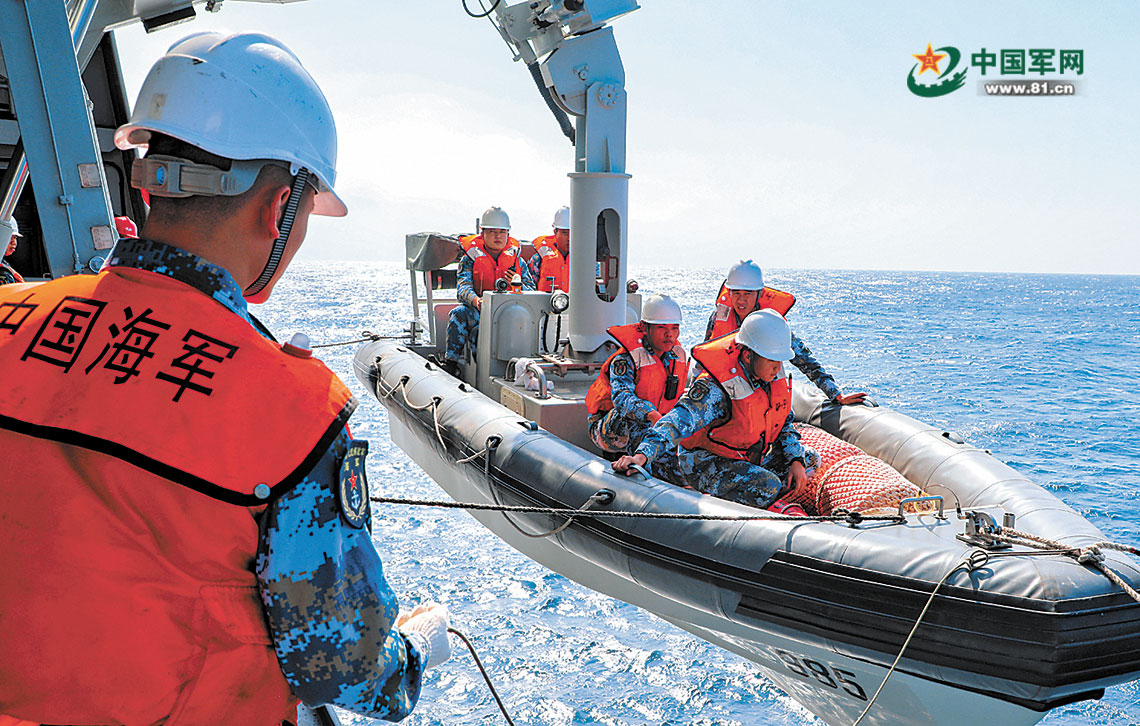 吊放小艇开展救援课目考核。