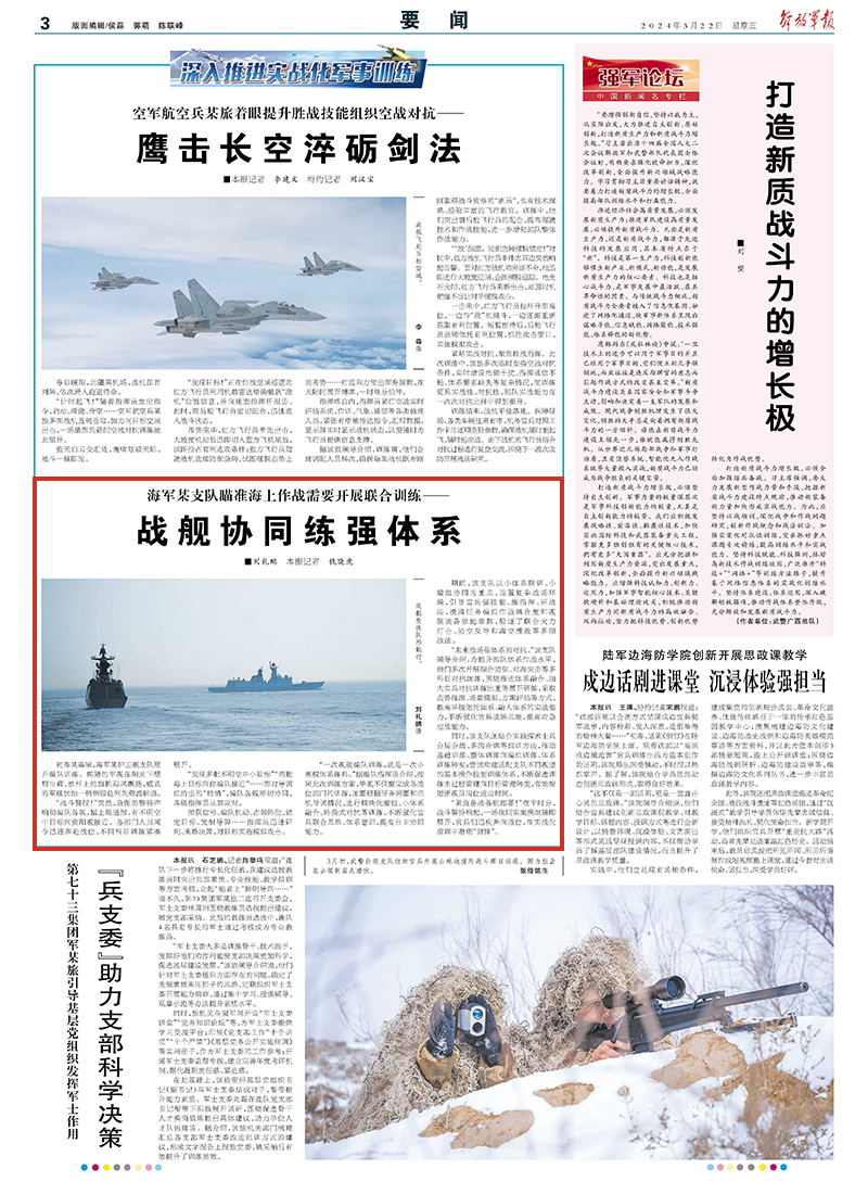 “未来战场是体系的对抗。”该支队领导介绍,为提升部队体系作战水平,他们多次开展综合防御、对海突击等多科目对抗演练,围绕推进体系融合、加大实兵对抗训练比重等展开研练,采取态势推演、场景模拟、方案评估等方式,提高单舰依托体系、融入体系的实战能力,不断强化官兵战场思维,提高应急应战能力。