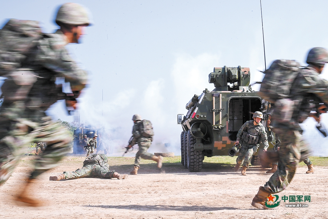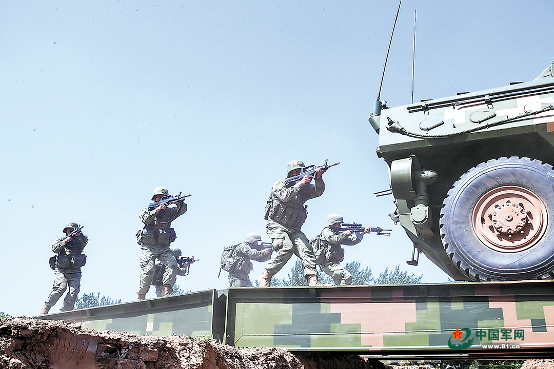 战车驶至目标地域,载员快速下车隐蔽。一声令下,爆破手手持爆破筒冲向“敌”防御工事,打通进攻道路。年轻的爆破手毫不畏惧、勇往直前,一如当年战斗中的老连长杨根思。
