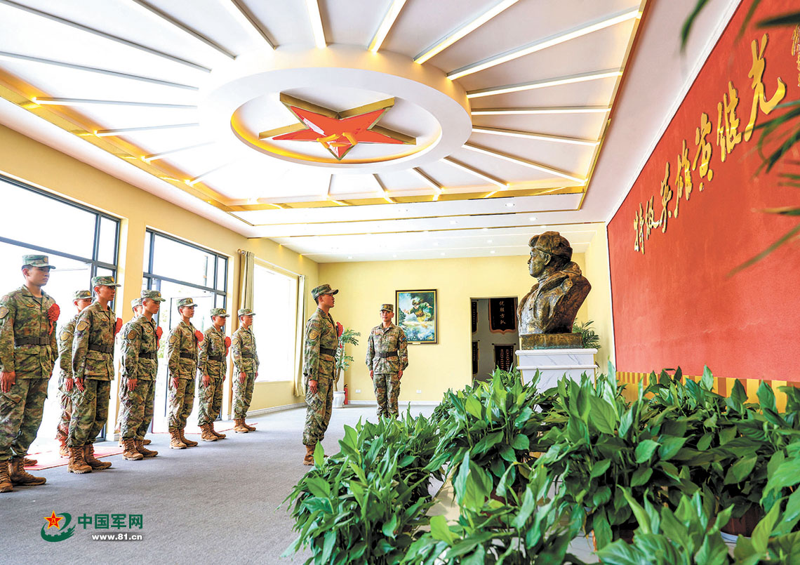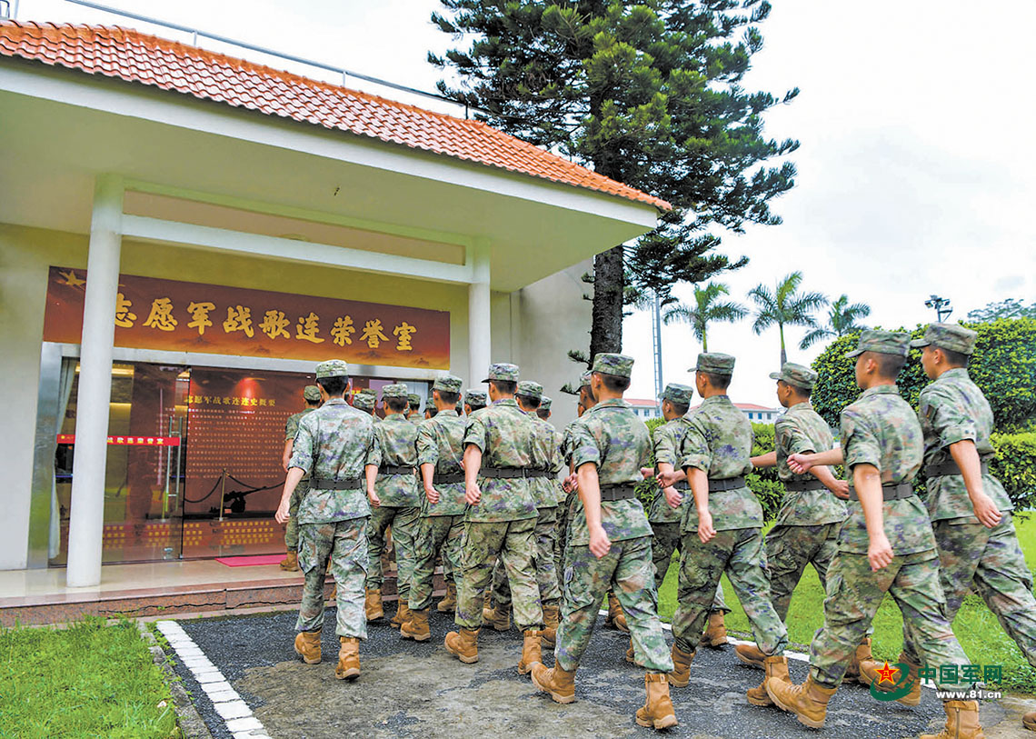 第74集团军某旅“志愿军战歌连”新兵走进连队荣誉室,参观学习连队光荣历史。胡少龙 摄