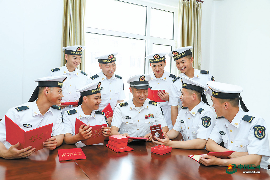 海军某部三级军士长肖升(前排中)向新兵介绍自己获得的荣誉,激励新兵立足岗位、建功军营。刘再耀 摄
