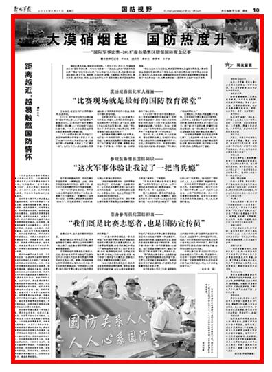 “群众关注的目光在哪里,就把国防教育的课堂延伸到哪里。”赛事组委会借国际军事比赛这个难得机遇,努力将比赛办成了解军营生活的窗口、展现军人风采的品牌、传播国防知识的平台和开展国防教育的阵地。请关注今日出版的《解放军报》的详细报道——