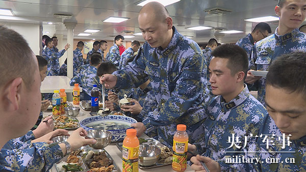 几天的航行,记者注意到,如今舰艇上的伙食已经非常丰富。这些来自全国各地的食物在餐桌上看起来普普通通,但因为包含着亲人的祝福,而有了任何顶级食材也不可比拟的家的味道。吃着自己刚刚做好的鱼丸,政委何坤回忆起母亲给自己带年货的情景。这位四十多岁的军人哽咽了:“我是大年初二一早从家里出发,母亲给我备了一大包年货,以鱼丸为主。带的时候我还嫌母亲拿得太多,我说飞机上面带不了这么多东西,但是心里面想,这是母亲对于儿子的一种寄托,一种心愿,也让我在千里之外能尝到家乡的味道。”