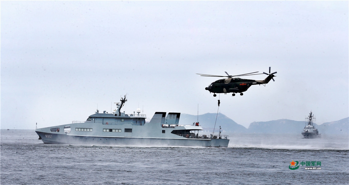 演练还在继续,此时指挥所再次传来命令:“XX海域发现可疑船只……”舰机编队闻令而动,立即奔赴相关海域。率先到达的直升机编队对可疑船只进行持续跟踪,并配合随后赶到的舰艇编队成功将可疑船只逼停。舰艇和直升机上搭载的特战队员从海上和空中对可疑船只实施立体突击,成功控制可疑船只。