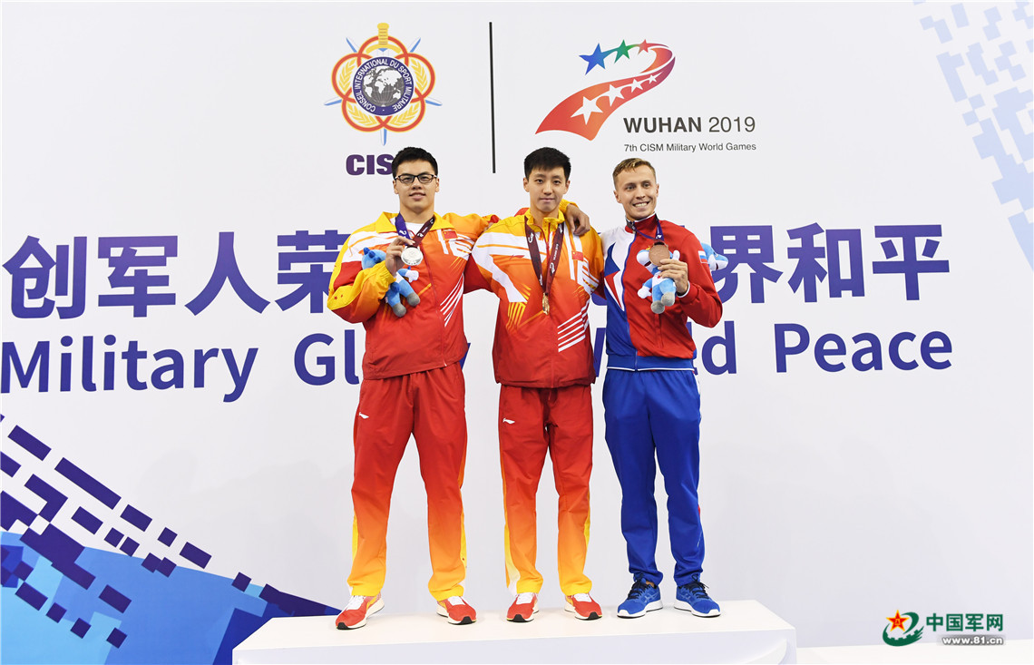 10月22日,第七届世界军人运动会水上救生比赛在武汉五环体育中心举行。中国队候钰杰(中)、凌华南(左)分获男子200米障碍游泳比赛冠、亚军。穆瑞林 摄