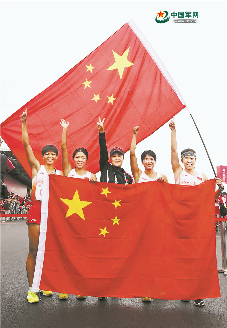 军事五项队女队成员庆祝胜利。 解放军报记者 王传顺摄