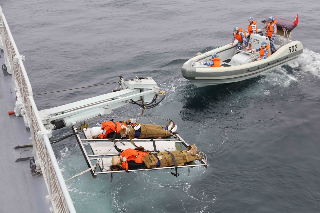 接舰期间,黄石舰组织官兵开启灭火、战伤救护、堵漏、排水等课目训练。