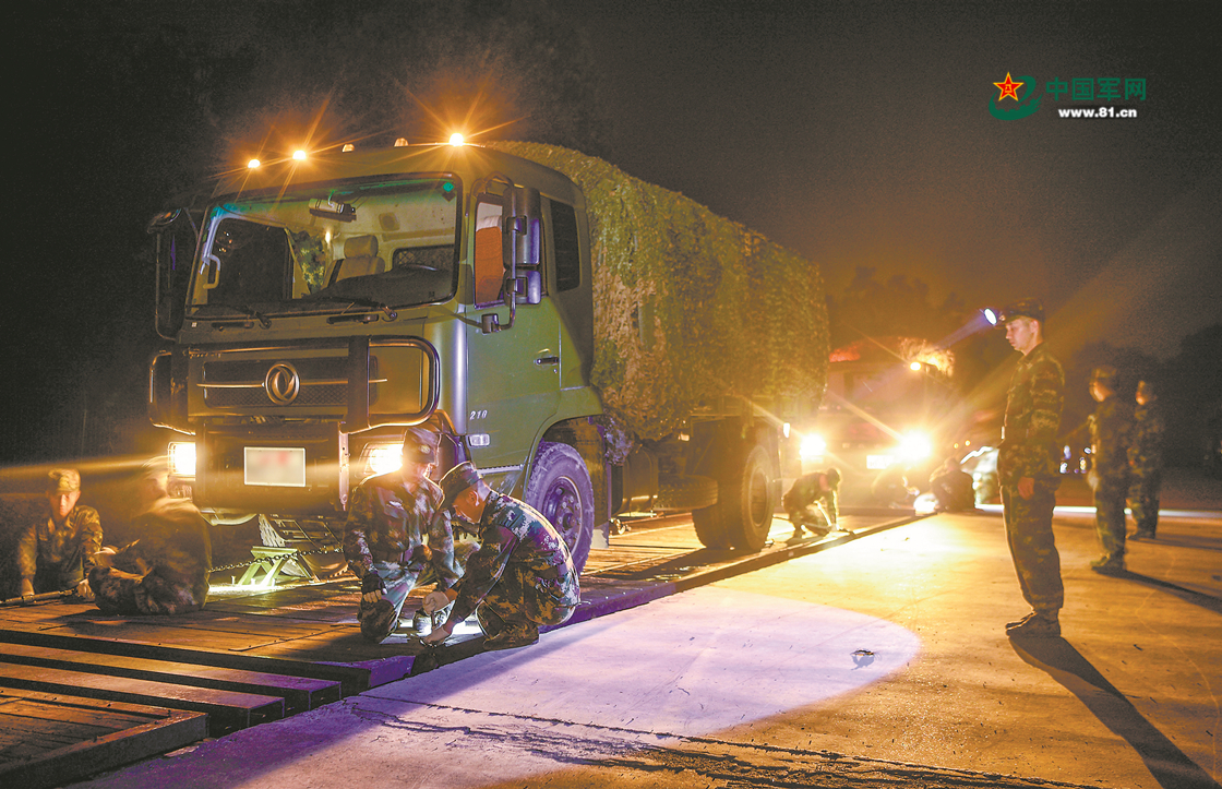 测量边距、打入铁钉、捆绑加固……铁路装载现场,官兵仅凭汽车近光灯和手电照明,熟练地进行分组作业。除了器械碰撞声,很少听到其他声音,全程一气呵成、干净利落。