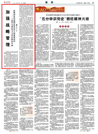 习主席出席解放军和武警部队代表团全体会议时,明确强调要加强战略管理。习主席的重要讲话,立意高远,针对性强,既抓住了实施军队建设“十四五”规划的关键环节和突出问题,又体现了前瞻性思考和全局性谋划。全军官兵要认真学习领会习主席重要讲话精神,创新战略管理,加强组织领导,确保实现“十四五”时期国防和军队建设良好开局。